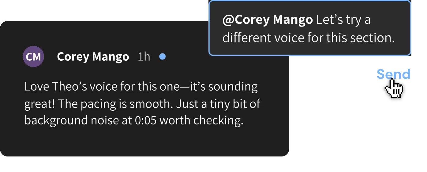 Share projects, leave comments, and manage voice libraries across your team.