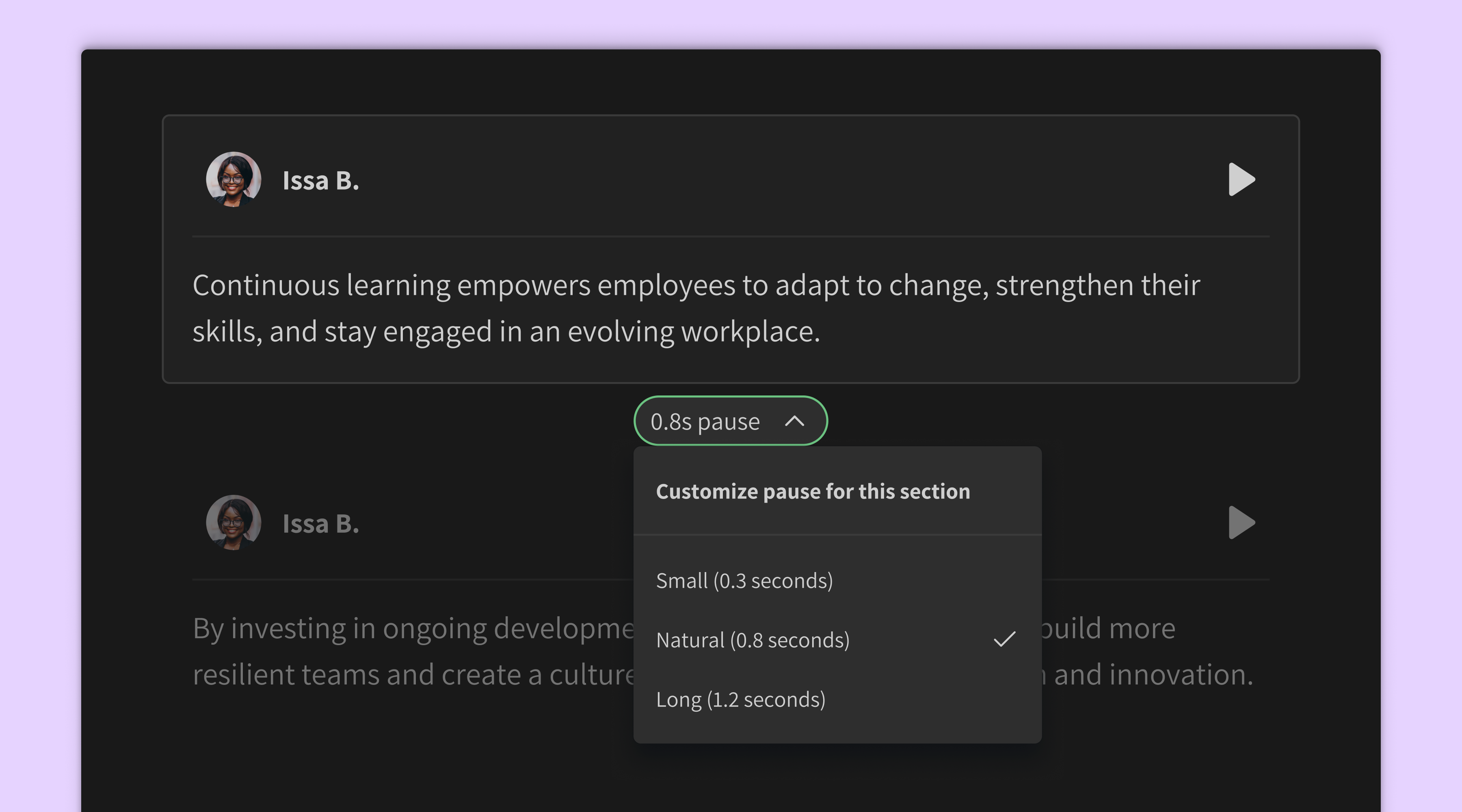 Pacing is now something you can control directly inside Studio. Creators can set pauses between sections without relying on workarounds or post-production edits. Pause controls appear between sections, with preset options or a custom duration up to 60 seconds. Changes apply immediately, and playback reflects them in real time.